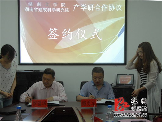 红网衡阳站5月11日讯(记者 谭倩 通讯员 肖中云) 5月10日,湖南工学院与湖南省建筑科学研究院达成产学研全面战略合作,并于湖南工学院综合教学大楼举行了签约仪式,湖南工学院校长、党委副书记罗建华,湖南省建筑科学研究院院长戴勇军出席签约仪式。