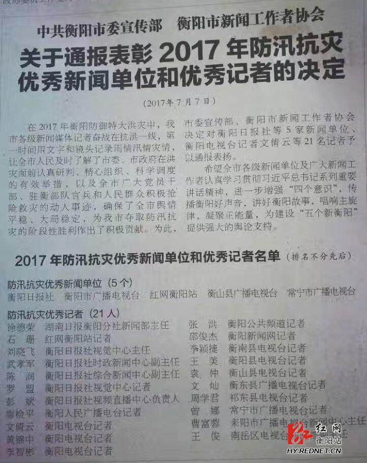 红网衡阳站7月21日讯(记者石珊)在2017年衡阳防御特大洪灾中,衡阳市各级新闻媒体记者奋战在抗洪一线,第一时间用文字和镜头记录雨情、汛情、灾情,为夺取防汛抗灾的阶段性胜利作出了积极贡献。近日,衡阳市委宣传部、衡阳市新闻工作者协会通报表彰了一批2017年防汛抗灾优秀新闻单位和优秀记者。其中红网衡阳站获优秀新闻单位、红网衡阳站记者石珊被评为优秀记者。