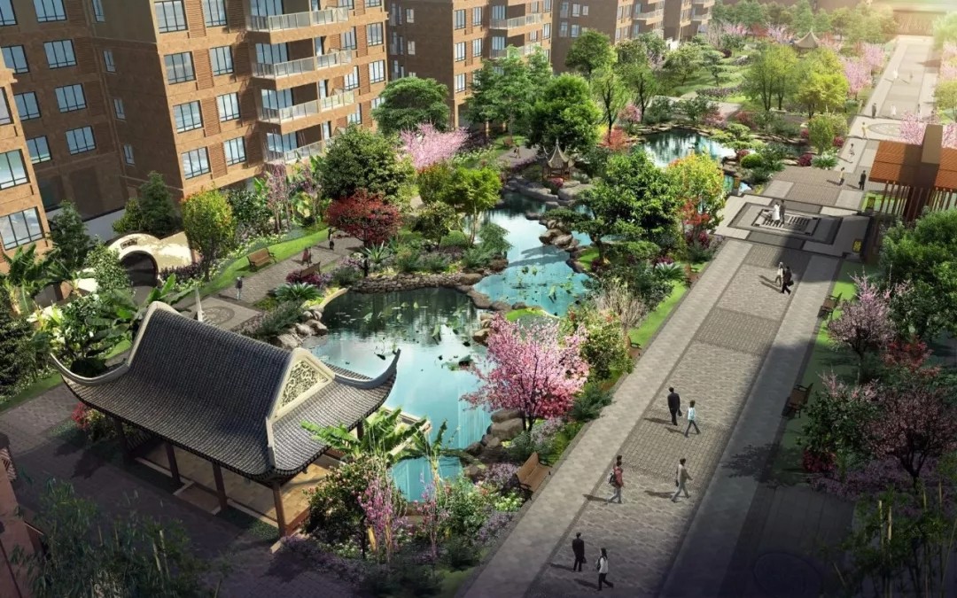 愉景雅苑水木清华中式景观园林,于主景观轴上突出规整、序列、仪式感,强调节点变化以及逐级空间的承接作用,领域感与尊贵感油然而生,形成雅致、端庄、威严的心灵图谱。