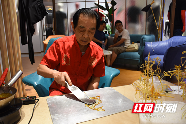杨天正现场演示糖画的制作工艺。