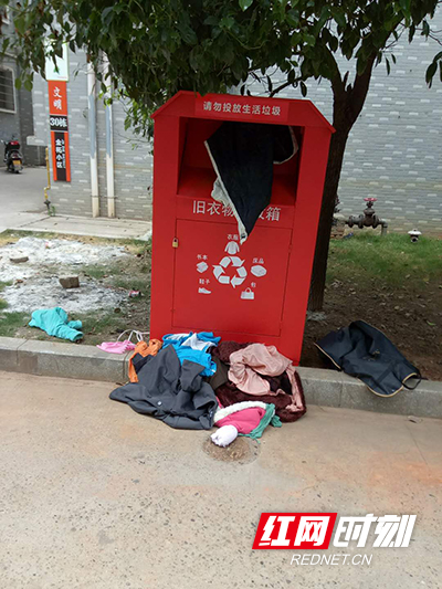 部分旧衣服被丢弃在回收箱前的无序局面。