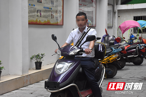 傅新上班路程遥远,在工作人员帮助下购买了二手摩托车。