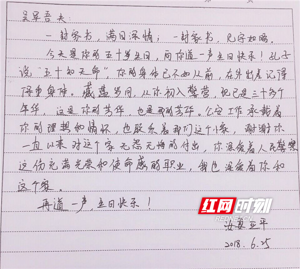 红网时刻衡阳6月26日讯(记者宋美君 通讯员 赵刚)2018年6月25日,对于很多人来说只是一个再普通不过的工作日,但对于从警三十年的经侦民警吴军来说这是个难以忘怀的日子,不仅仅是因为有同事陪伴在外出差过得第“N”个生日,更是因为妻子的一封家书和支队长的一封回信让他备受感动和鼓舞。