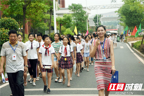 学校老师引领孩子们参观校园。