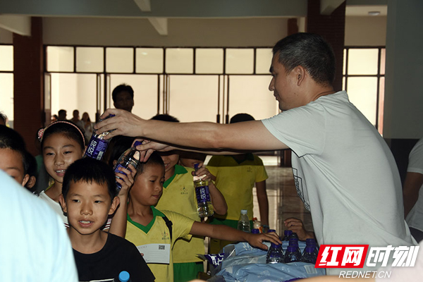 为学生发放矿泉水。