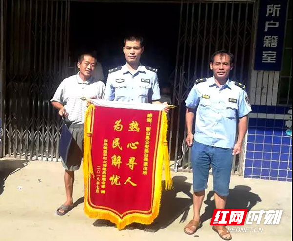 红网时刻衡阳7月17日讯(记者 宋美君 通讯员 谭宗阳) 7月16日上午,在衡山县公安局白果派出所,白果镇村民吴某顺将一面写有“热心寻人、为民解忧”的锦旗送到民警手中,并连声说道:“谢谢你们帮我找回女儿,真是太谢谢你们了!”