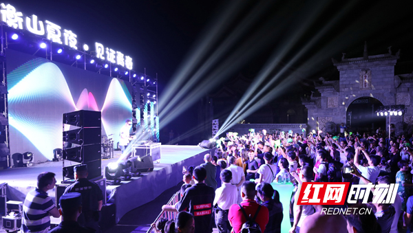 当晚,在南岳衡山上封寺前坪,南岳星空音乐节燃爆全场。开场一段炫酷的动感乐瞬间燃起了在场观众的激情,现场观众随着音乐一起摇摆跳跃。啤酒、软饮、发光吧台与璀璨舞台交相呼应,DJ打碟的狂热如沸腾的水壶盖不停跳动,熟悉的曲目、动感的节奏,燃爆了现场氛围。