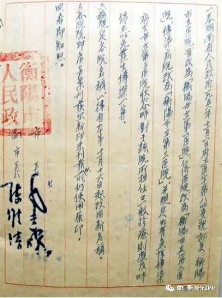 衡阳市第一任市长毛远耀签署的第一份组建医院的批文