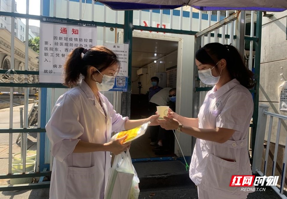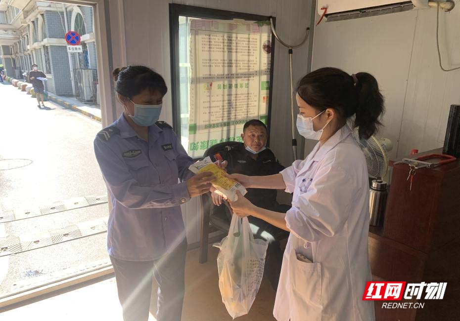 工作人员为医院东门机关职能部门防疫执勤人员送上夏桑菊饮品,解暑降温。