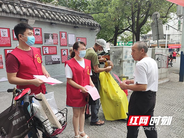 耒阳市志愿者沿街向商户和居民发放《耒阳市中元节文明祭祀倡议书》。