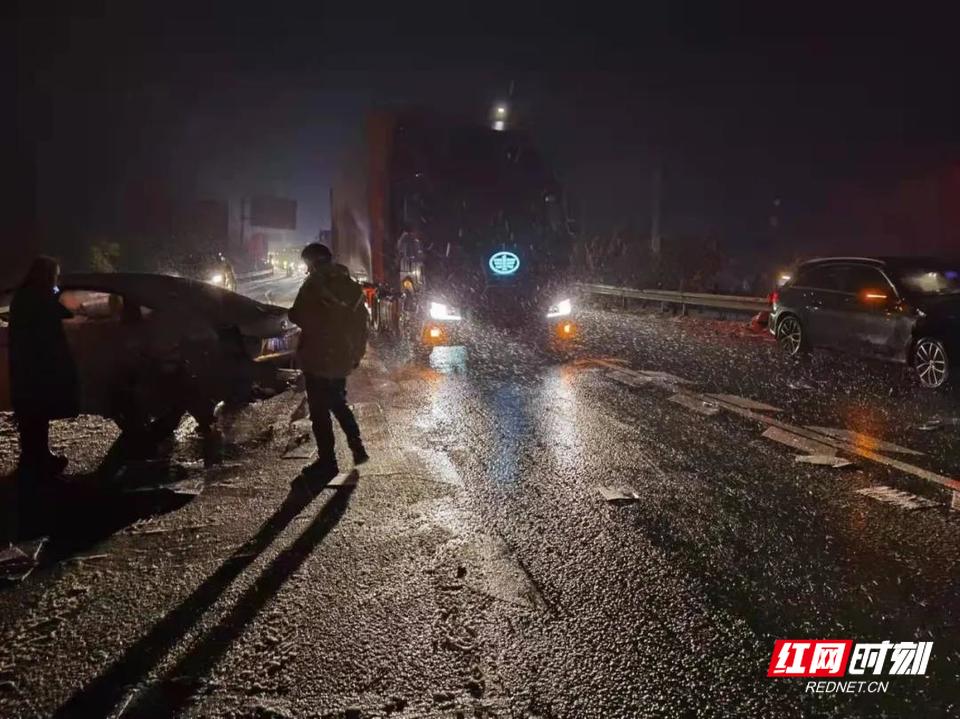 红网时刻衡阳12月29日讯(通讯员 毛娟 记者 蒋楠)12月26日,大雪如期而至,纷飞的雪花和凛冽的大风让京港澳高速衡阳段变得银装素裹,三辆行驶在高速公路上的车辆发生追尾事故,车辆被困,有儿童受惊,冰雪寒夜里,湖南高速集团衡阳分公司衡东养护所的工作人员为他们送上了暖心服务。