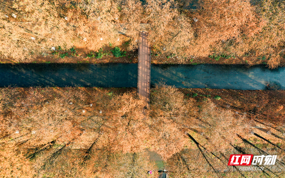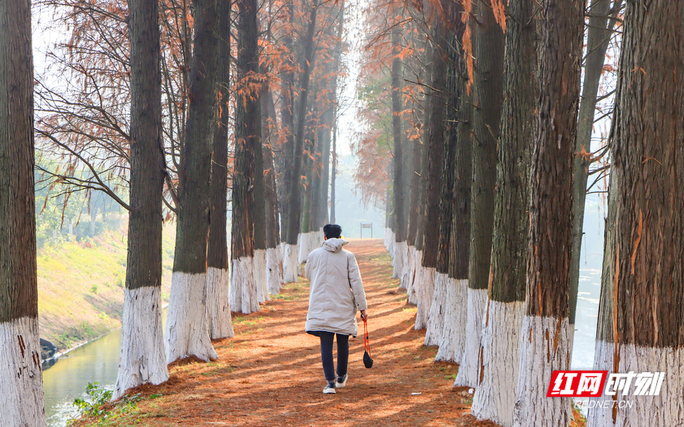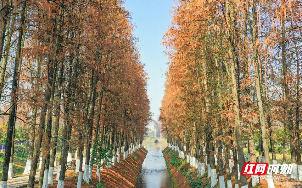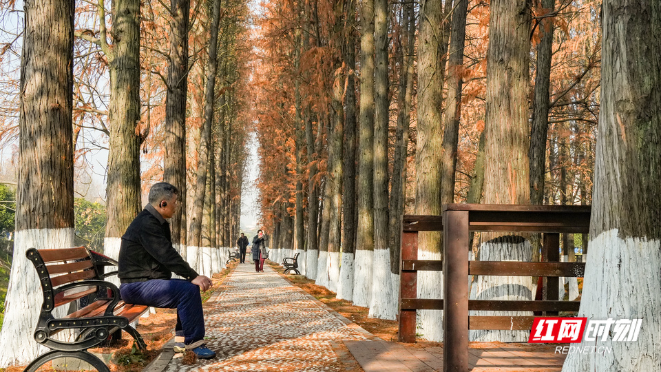 红网时刻新闻1月13日讯(记者 宋美君 李璐 实习生 刘赢 杨安琪)冬日暖阳普照,衡阳市雁峰区岳屏镇隆桥村幸福河两岸的水杉林换上赭红与金黄交织的“盛装”,宛如一幅徐徐展开的天然油画,成为市民争相探访的冬日秘境。