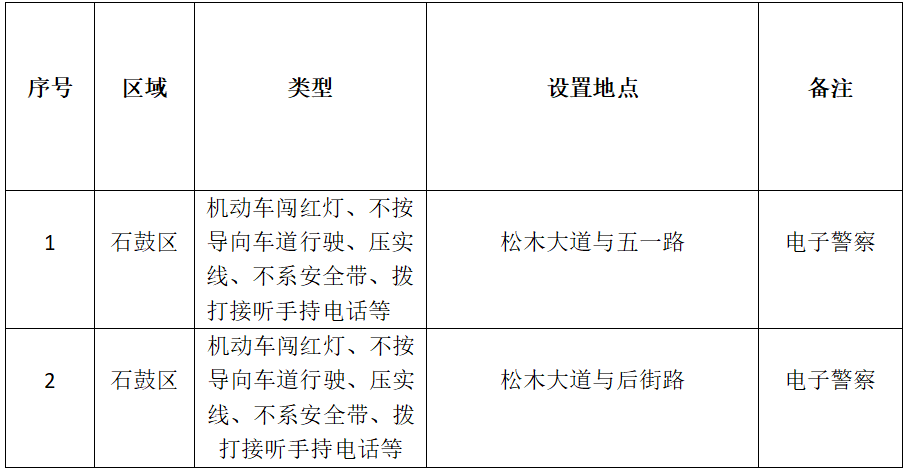 为保障道路交通安全、有序、畅通,预防和减少交通事故的发生,促进市民安全文明出行。衡阳市公安局交通警察支队将新增安装启用2处电子监控设备,抓拍具体违法行为有:机动车闯红灯、不按导向车道行驶、压实线、不系安全带、拨打接听手持电话等。现将新设置的电子监控设备抓拍点公告如下: