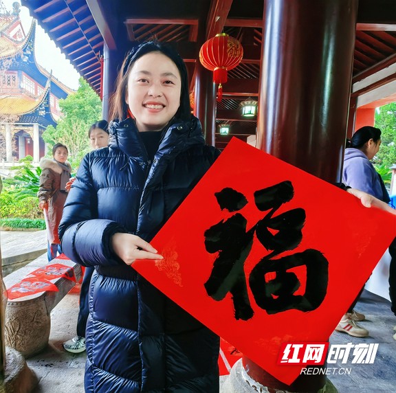 市民手捧墨香浓郁的福字,笑容满面。文兰 摄