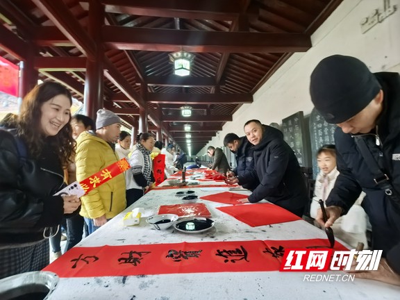 与此同时,大庙东西长廊的“春联送福”区域也聚满了人群。由十余位书法爱好者组成的书写队伍,现场挥毫泼墨,一副副寓意吉祥、笔力遒劲的春联和一张张“福”字顷刻而成,受到群众热烈欢迎。大家手捧墨香浓郁的春联,笑容满面,在古韵悠长的建筑背景下合影留念,为即将到来的农历新年增添了浓浓年味。