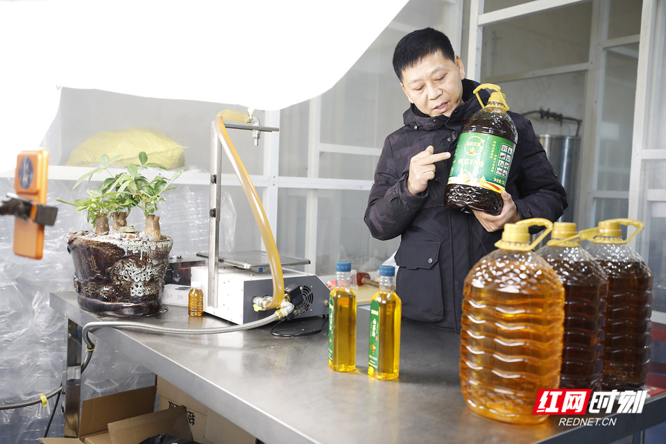 今年春节前夕的一个月时间,农湘榨油坊食用油销量比去年同期增长了十倍,其中菜籽油约4吨, 茶油2000余斤,还通过线上直播,香飘万里,订单源源不断。这一当地特色产业项目,通过联农带农机制,不仅带动村民就业,更壮大村集体经济,醇香的油脂飘出浓浓年味。