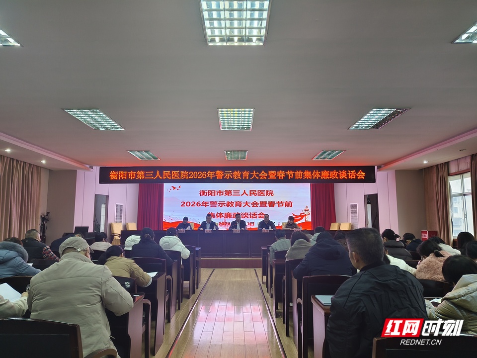 红网时刻新闻2月11日讯(通讯员 胡秋香)2月11日上午,衡阳市第三人民医院组织召开2026年警示教育大会暨春节前集体廉政谈话会,结合春节这个关键时间节点,引导全体干部职工绷紧廉洁自律弦、守牢作风建设关,确保度过一个风清气正、平安祥和的新春佳节。