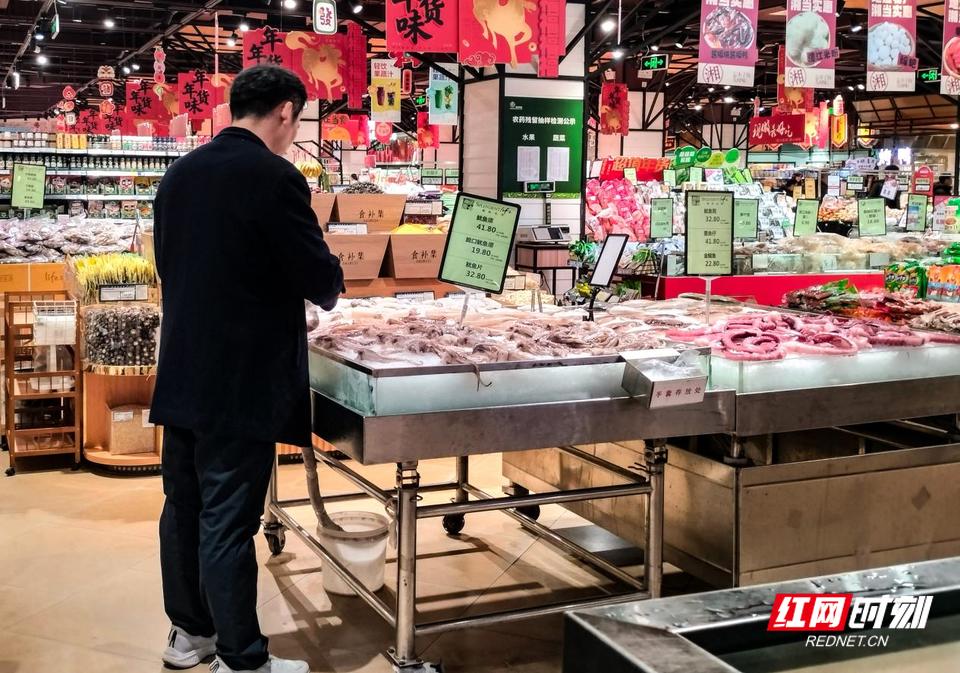 走进市区一家大型超市,海鲜区的品类比平常更为丰富。鱿鱼、墨鱼仔整齐摆放在冰块上,一只只绑好的螃蟹静置在冷柜中;循环水池里,基围虾、罗氏虾不时弹跳,养殖鲟龙鱼、吊水黄骨鱼等也在水中自在游动。