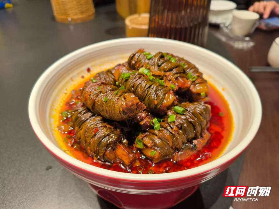 这份“土味”更在创新中延续。“每季都会根据时令调整菜品,守住衡阳味的同时求新。”总厨胡函凌介绍,招牌菜“神仙捆肉”便是对传统扣肉的改良——用薄切五花肉夹香芋,再以干豆角捆扎,既保留本土特色,又化解了传统扣肉的油腻感,成了门店“爆品”,引得同行慕名学习。耗时半年研发的鱼汤鼎锅饭,则以柴火煮制的鱼汤米饭搭配秘制鱼肉酱,还原乡土风味,上海食客金建军评价“味道很不错,有家的味道”。