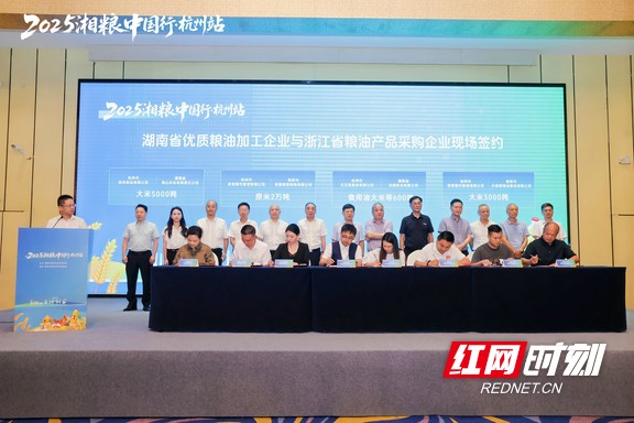 2025年9月17日,“2025湘粮中国行·杭州站”优质粮油产品展销推介活动上,商会餐饮企业与衡阳粮油企业签约。