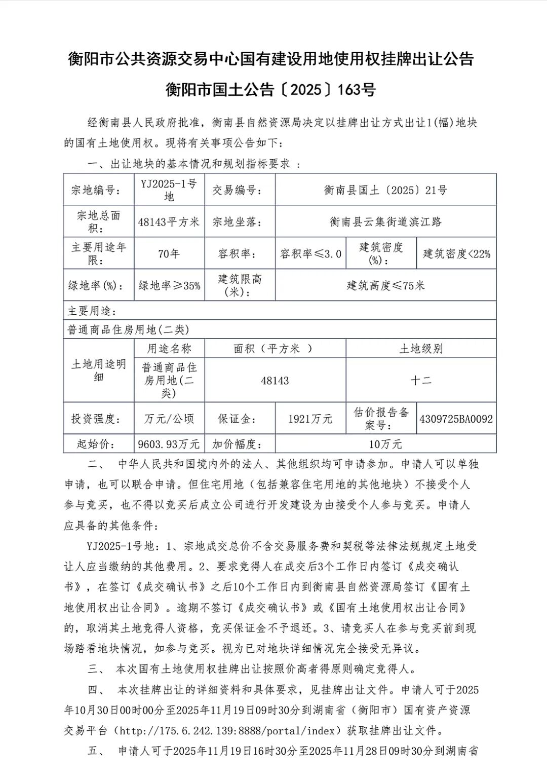 衡南县城YJ2025-1号地块招拍挂