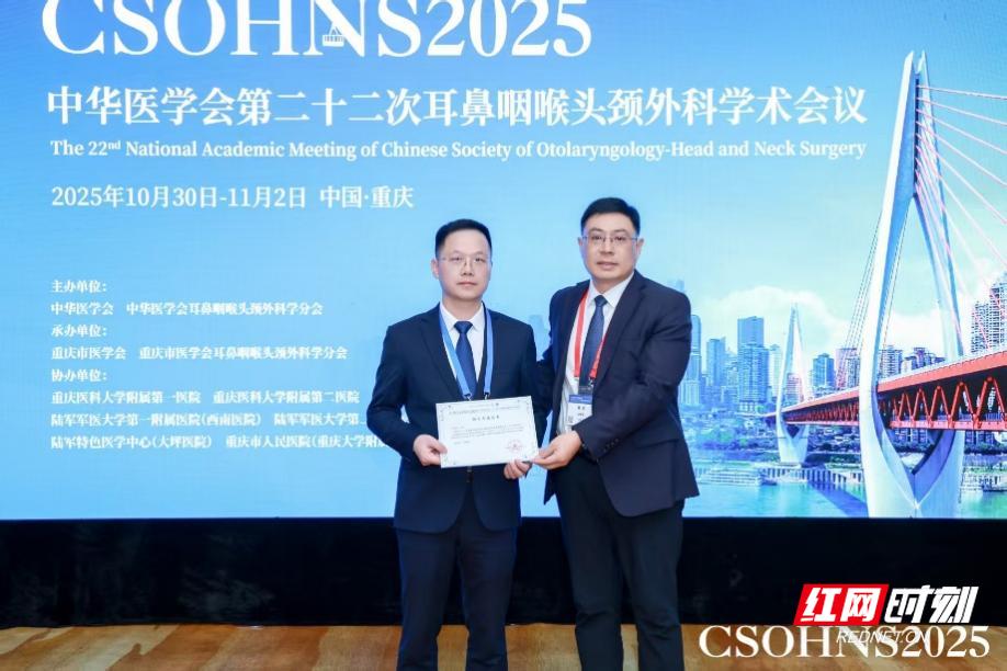 红网时刻新闻11月5日讯(通讯员 苏冰悦)近日,2025年中华医学会耳鼻咽喉头颈外科学分会年会于重庆圆满落幕。在这场代表国内顶尖水准的学术盛会上,南华大学附属第一医院耳鼻咽喉头颈外科团队再展风采,其科室副主任刘志锋医师凭借丰硕的学术交流成果,特别是在鼻颅底外科这一高精尖领域的前沿探索,获得了全国同行的广泛关注与高度认可。