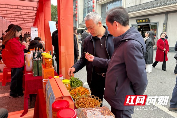 在深入感受与了解了衡东风物及土菜产业规划后,一场浓缩衡东地域风味的“一乡一品”特色食材展在状元人家前坪精彩亮相。展区汇聚了来自全县15个镇、2个乡的优质食材,既有三樟黄贡椒、德圳茶油等声名在外的地标产品,也有各具特色的米酒、香干、腊味等特色农产品,吸引了众多本地居民与参会者驻足询价、购买,现场人潮涌动,气氛热烈,生动展现了衡东丰饶物产的市场吸引力。