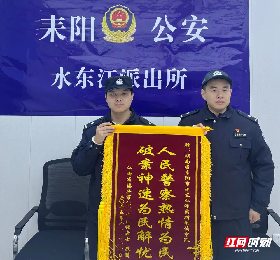 红网时刻新闻12月31日讯(通讯员 曾芸)近日,耒阳市公安局水东江派出所收到江西省德兴市张女士寄来的一面锦旗,锦旗上的“人民警察热情为民 破案神速为民解忧”字样,讲述了一段特别的警民情谊。