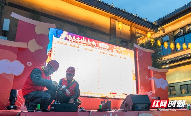 红网时刻新闻12月31日讯(通讯员 陈妍霏)夜幕降临,南岳里街区内人群熙攘、灯火璀璨、烟火升腾。12月30日,国网衡阳供电公司工作人员驻守南岳里文化街区,细致协助客户检测舞台搭建的电流电压是否稳定,以专业的服务守护辞旧迎新的跨年活动。