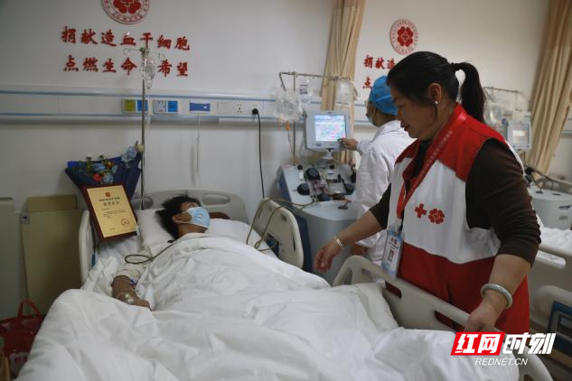 采集正在进行中,红十字会工作人员在床旁细心看护。